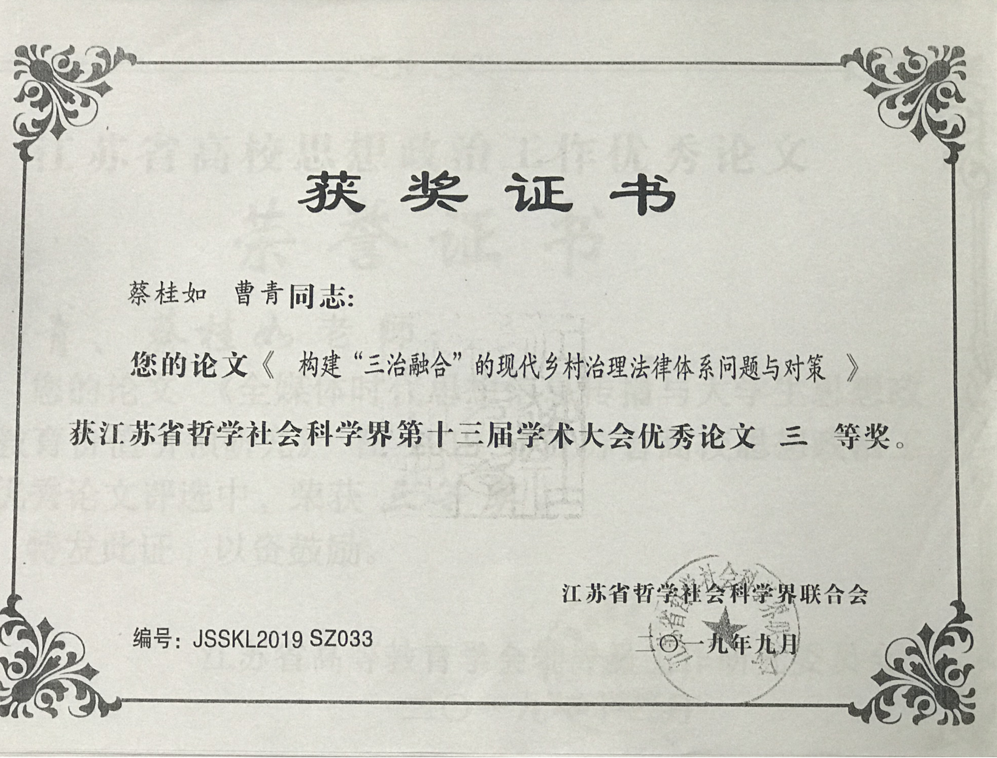 2019年11月13日,“江苏省哲学社会科学界第十三届学术大会”优秀理论研讨论文获奖名单揭晓,公司马克思主义公司蔡桂如、曹青老师的《构建“三治融合”的现代乡村治理法律体系问题与对策》荣获三等奖。