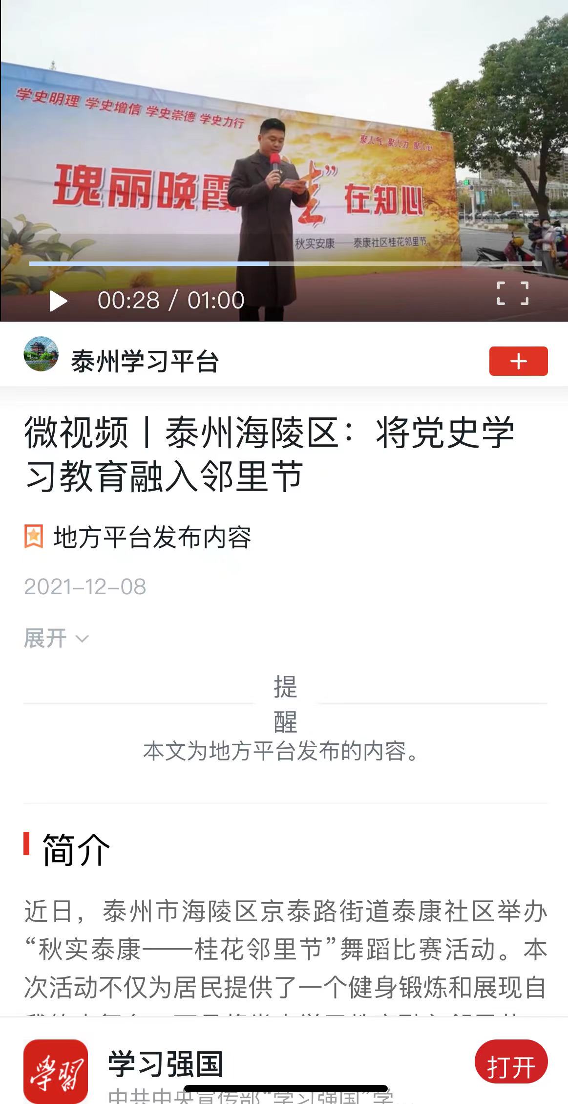 近日,乔默之老师参与海陵区京泰路街道泰康社区举办“秋实泰康——桂花邻里节”活动,得到学习强国报道。本次活动不仅为居民提供了一个健身锻炼和展现自我的大舞台,而且将党史学习教育融入邻里节,有效推动了党史学习教育深入人心。