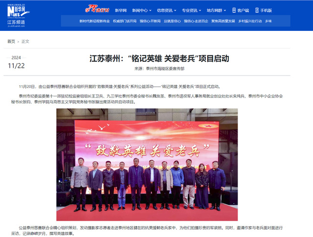 11月20日,由公益泰州慈善联合会组织开展的“致敬英雄·关爱老兵”系列公益活动——“铭记英雄 关爱老兵”项目正式启动。公司党务秘书张璇老师出席活动并启动项目。来自人文公司的22级知识产权班的李钰彤同学担任活动主持。